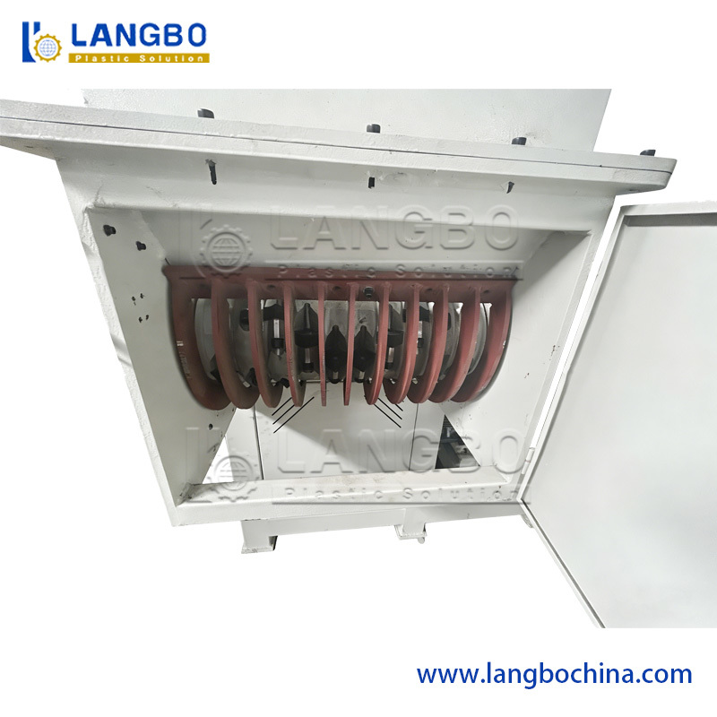 Trước khi dây chuyền đùn ống HDPE hoạt động trơn tru để đùn ống, công nhân cần khởi động máy và điều chỉnh mọi chi tiết trong suốt quá trình. Trong quá trình này, sẽ tạo ra nhiều cục nóng chảy PE bị lãng phí. Chúng là những khối lớn và đủ cứng. Vì vậy, nó không thể được xử lý bằng máy nghiền, nó chỉ có thể được xử lý bằng máy băm. Máy băm một trục của chúng tôi có tốc độ quay cao và dao hình dạng. Công nhân đưa các cục nóng chảy bị lãng phí qua cửa nạp và các hạt sẽ rơi ra từ cửa xả.